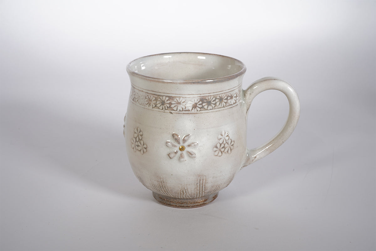 印判を陶器に押し装飾する三島手の花柄と、陶土を盛り上げて立体感を出した花柄の二種の技法で装飾されています。