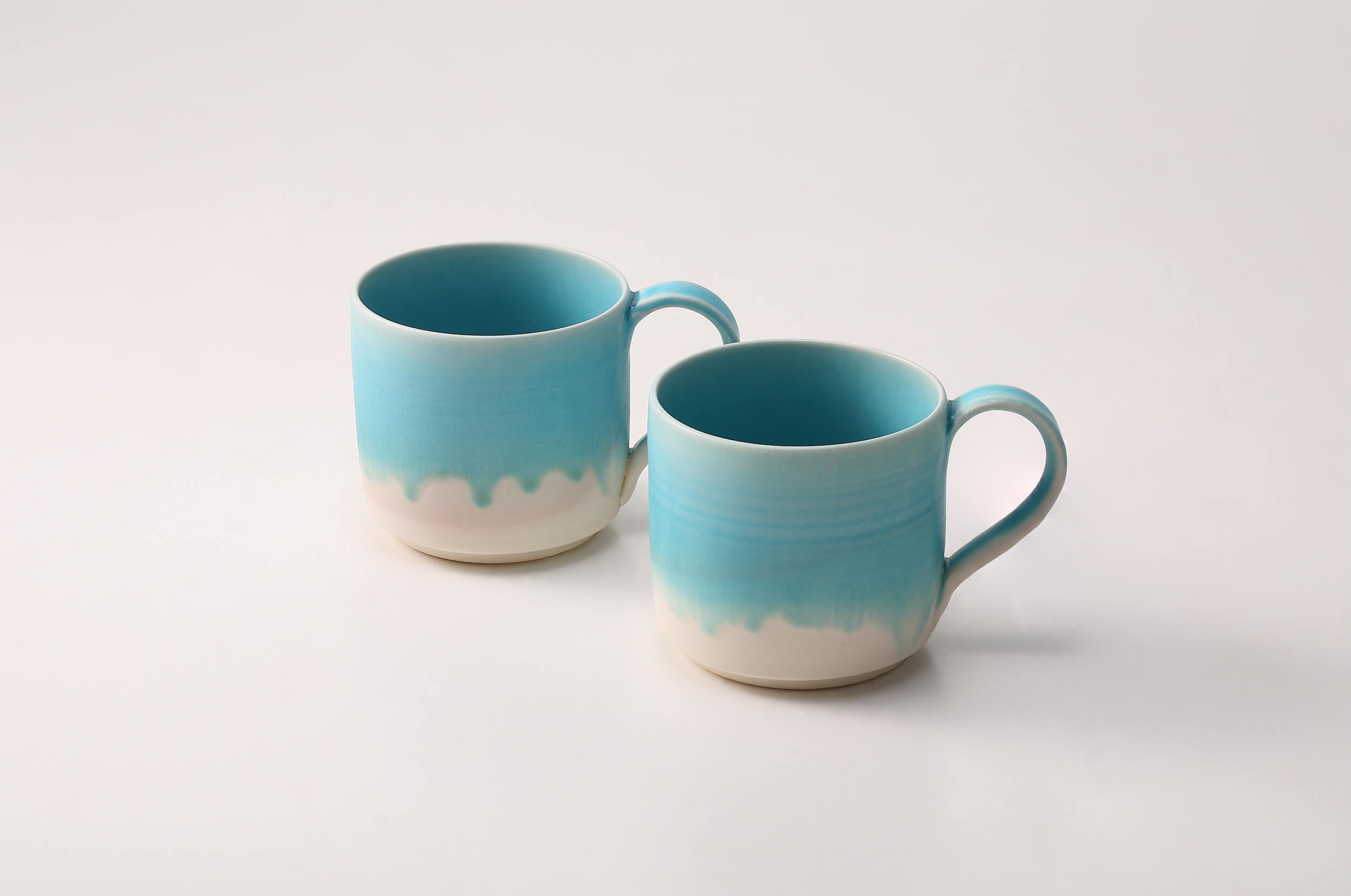 青の釉薬にこだわったシリーズ。カップ類はひとつづつ異なる側面の釉薬の景色を楽しめ、皿では中央に溜まった釉薬が作り出す深海の色とグラデーションを楽しめます。爽やかなオーシャンブルーが食卓を彩ります。